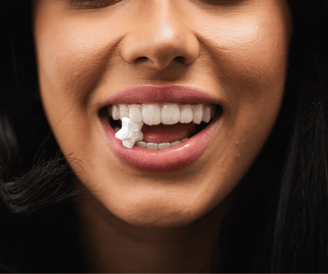 You simply insert it between your aligners and apply gentle pressure. Move across your teeth until your aligners are fully seated, then enjoy the great taste of StarMintz.